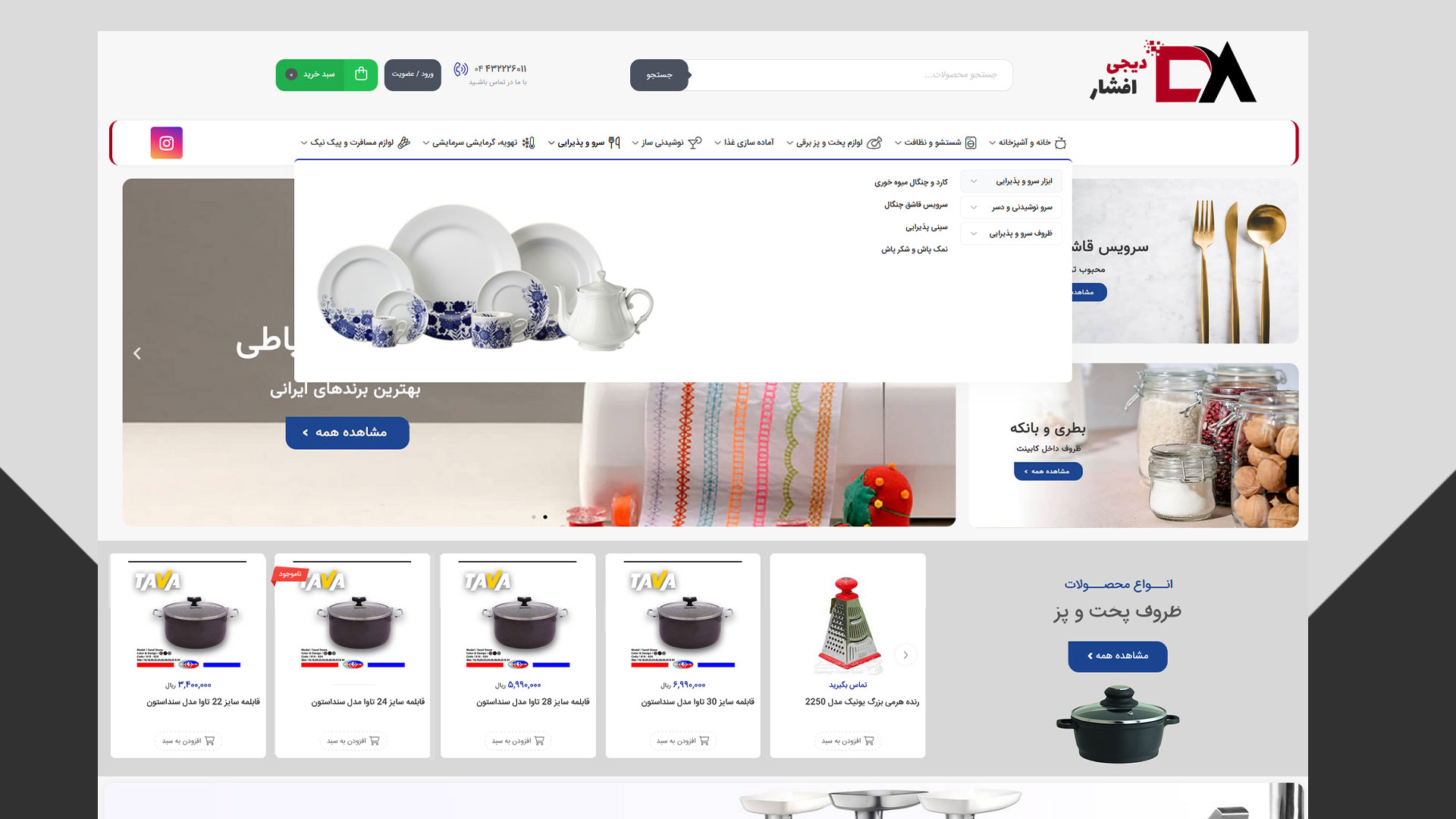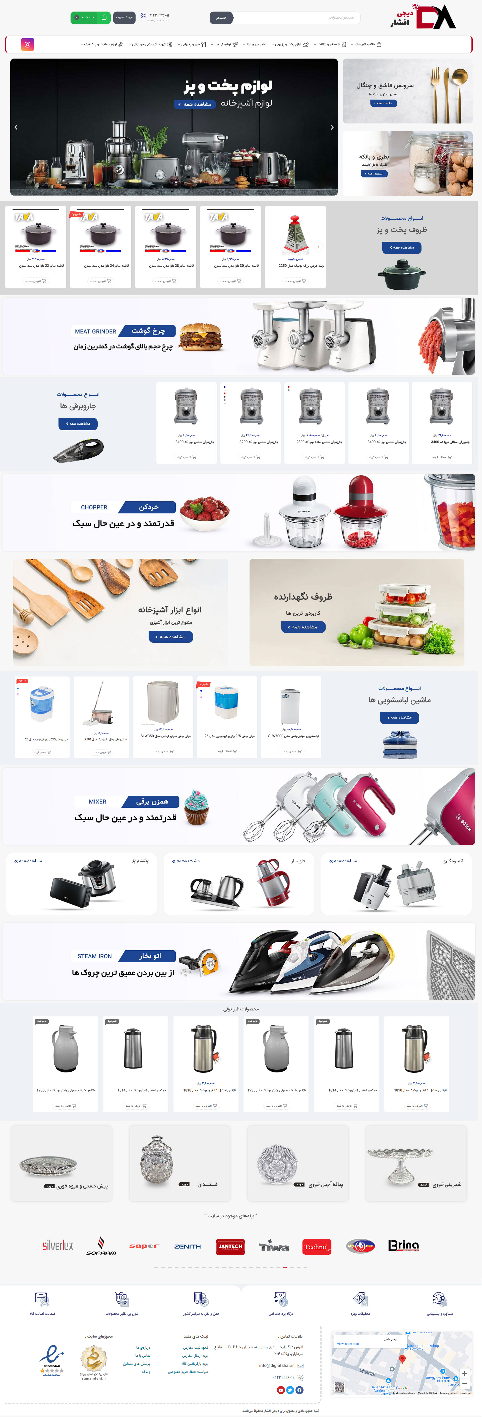طراحی این سایت فروشگاهی مدرن و کاربرپسند انجام شده و به‌خوبی نیازهای یک فروشگاه اینترنتی حرفه‌ای را برطرف می‌کند. استفاده از اسلایدر بزرگ و باکیفیت در بخش بالایی سایت با نمایش محصولات آشپزخانه و پیام‌های تبلیغاتی، توجه کاربران را به بخش‌های کلیدی جلب می‌کند و معرفی اولیه‌ای از فروشگاه و محصولات را ارائه می‌دهد.