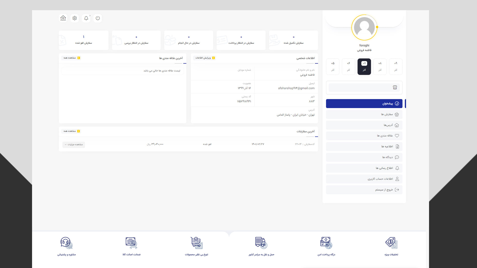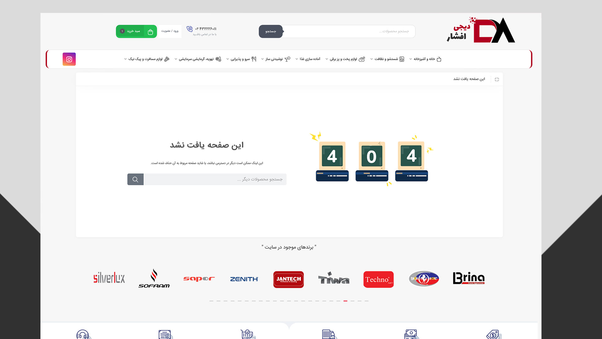 بخش فوتر سایت شامل اطلاعات تماس، نقشه فروشگاه، لینک‌های دسترسی سریع و نمادهای اعتماد الکترونیک است که تکمیل‌کننده ساختار حرفه‌ای و کاربرپسند سایت است. طراحی فونت‌های خوانا و مدرن در کنار فضای سفید مناسب بین بخش‌ها، تجربه کاربری راحت و بدون سردرگمی را ایجاد کرده و کاربر به‌راحتی می‌تواند در صفحات سایت حرکت کند.