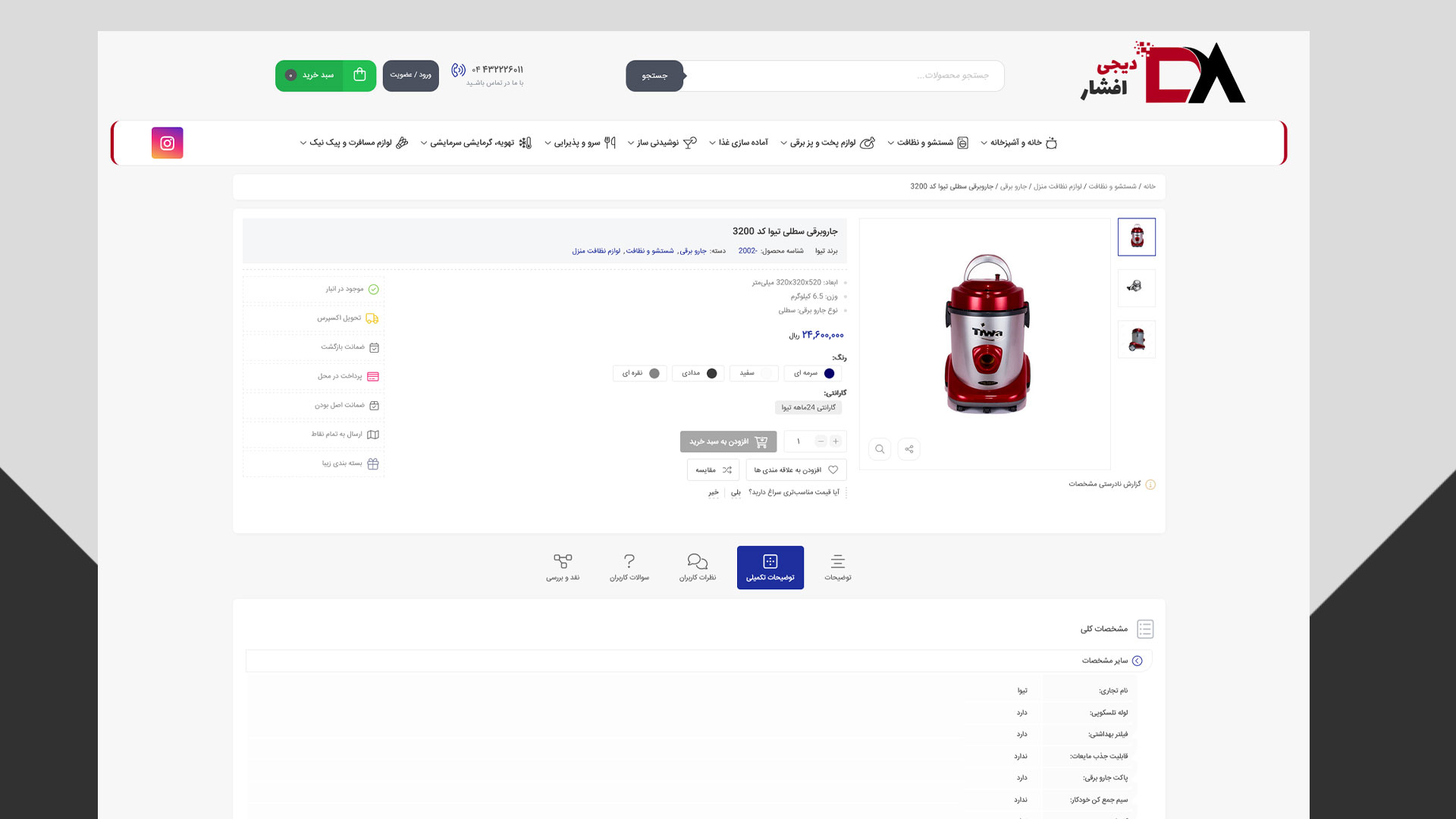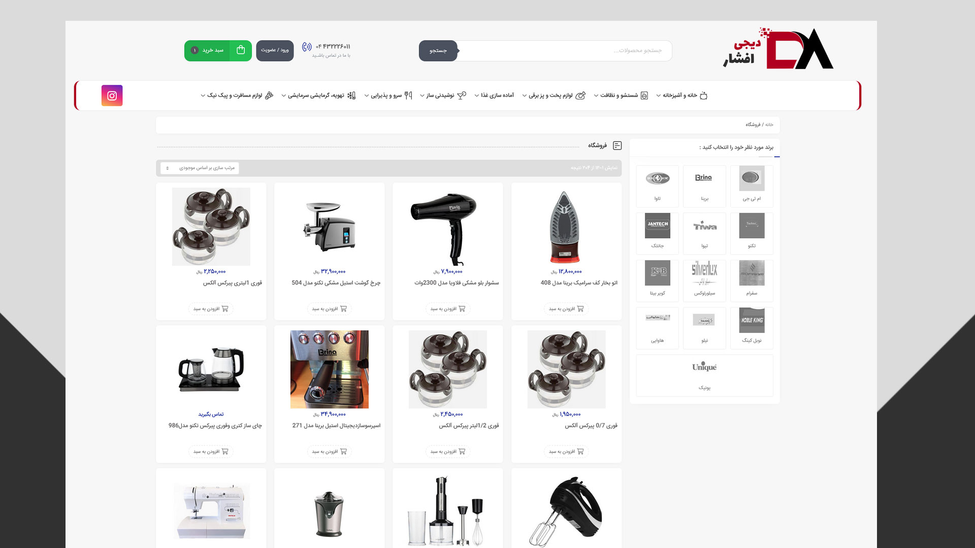 محصولات در قالب کارت‌های مرتب و شبکه‌ای نمایش داده شده‌اند که شامل تصویر باکیفیت محصول، نام، قیمت و نشان‌های ویژه مانند «تخفیف» هستند و تجربه خرید کاربر را آسان و جذاب می‌کند. تصاویر محصولات کاملاً واضح و جذاب بوده و هماهنگ با پس‌زمینه‌های روشن سایت به نمایش در آمده‌اند. دسته‌بندی محصولات به‌صورت اسلایدر افقی و گاهی عمودی طراحی شده که دسترسی به محصولات را سریع‌تر می‌کند. بخش‌هایی مانند معرفی محصولات خاص ازجمله همزن برقی، چرخ گوشت و اتو بخار با طراحی گرافیکی جذاب و متن‌های تبلیغاتی هوشمندانه به‌خوبی برجسته شده‌اند.