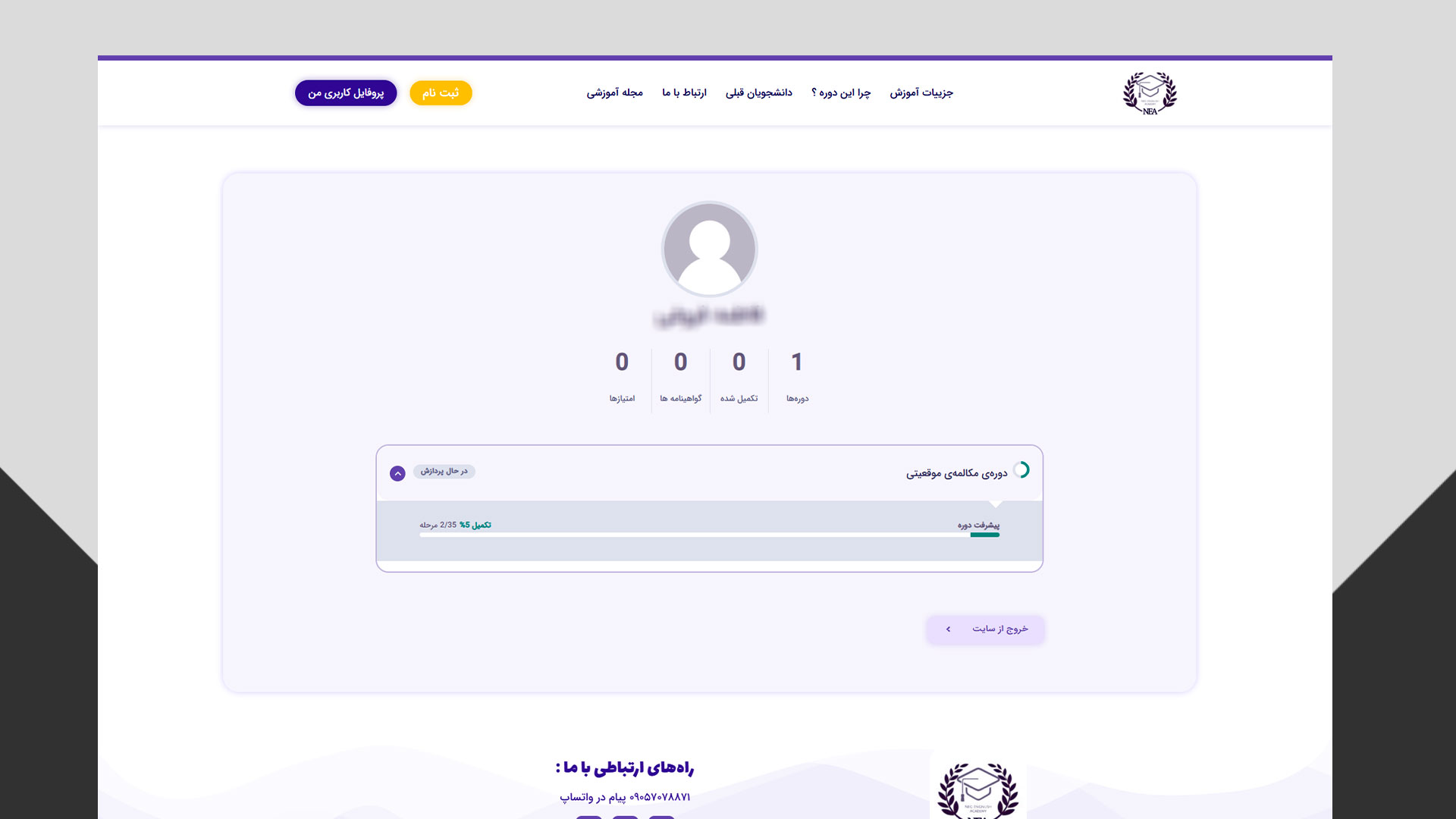 پروفایل کاربری یکی از امکانات کلیدی سایت است. بعد از ثبتنام و تایید پرداخت، کاربران به پروفایل شخصی خود دسترسی پیدا میکنند. در این بخش، اطلاعات مرتبط با دورهها، میزان پیشرفت، و تعداد دورههای تکمیلشده نمایش داده میشود. نمایش گرافیکی پیشرفت دورهها (مثل نوار درصد تکمیل) باعث میشود کاربران بتوانند وضعیت یادگیری خود را بهصورت بصری دنبال کنند و انگیزه بیشتری برای تکمیل دورهها داشته باشند.