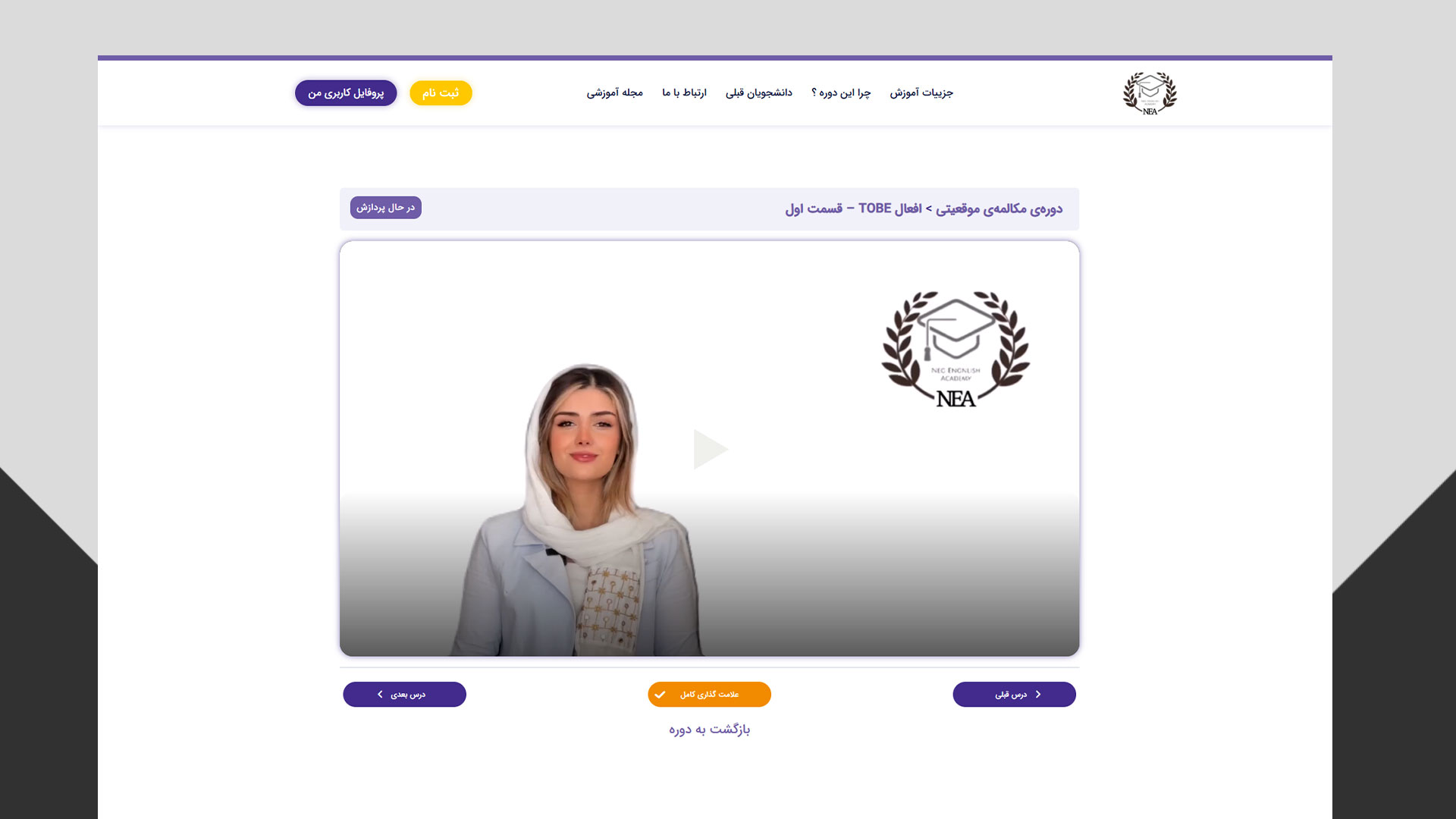 طراحی پلیر سایت به کاربران امکان مشاهده ویدیوهای آموزشی در یک پلیر ساده و کاربرپسند را فراهم میکند. این طراحی به گونهای انجام شده که در مرکز توجه قرار دارد و تجربه بصری کاربر را بهبود میبخشد. ناوبری و کنترلهای ویدیو با دکمههایی مانند “درس قبلی” و “بازگشت به دوره” در پایین صفحه، دسترسی آسان و سریع به محتوای آموزشی را فراهم کرده است. دکمه “علامتگذاری کامل” نیز به کاربران امکان میدهد که پیشرفت خود را پیگیری کنند و حس سازماندهی بیشتری داشته باشند.