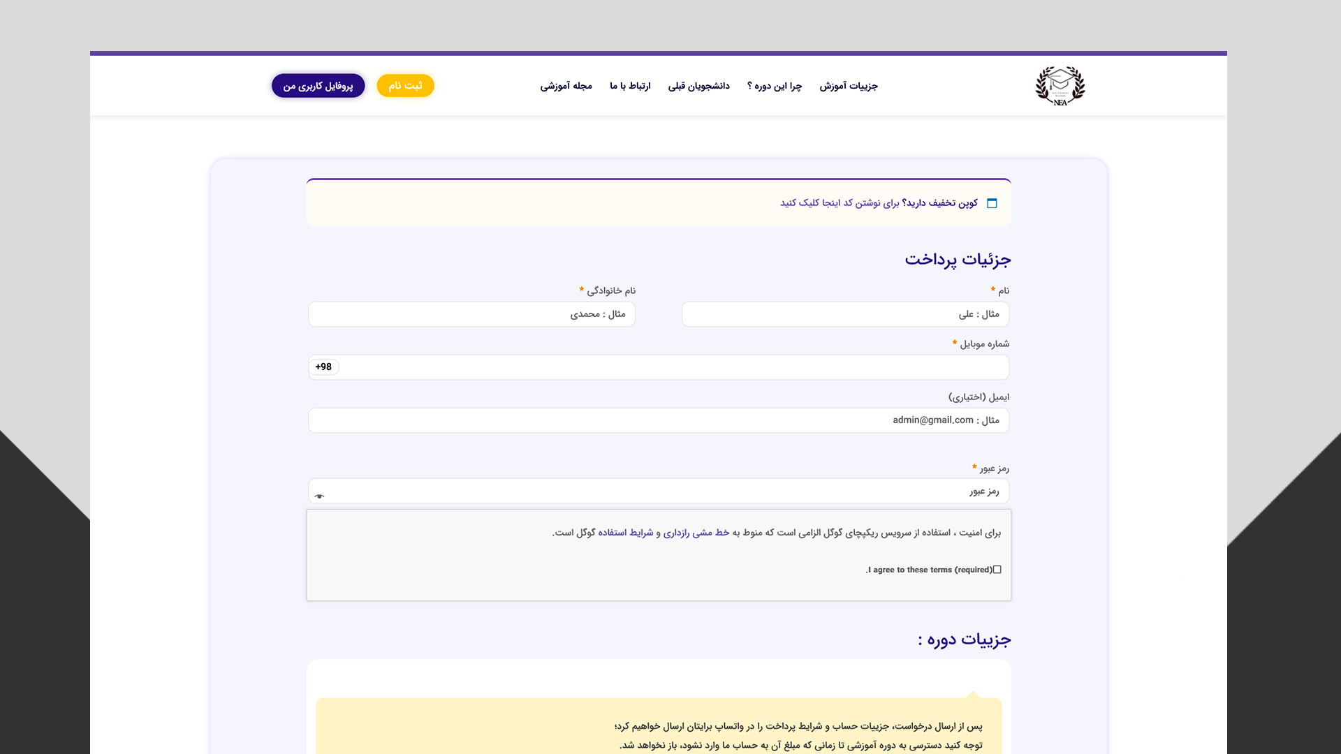 یکی از امکانات کلیدی این سایت، امکان ثبتنام کاربران برای خرید دورهها است. فرآیند ثبتنام بهصورت ساده و کاربرپسند طراحی شده است تا کاربران بدون سردرگمی، حساب کاربری خود را ایجاد و دوره مورد نظر خود را خریداری کنند. بعد از تایید پرداخت، یک پروفایل کاربری به کاربر اختصاص داده میشود که از طریق آن میتوانند به تمام محتوای دورهها دسترسی داشته باشند.